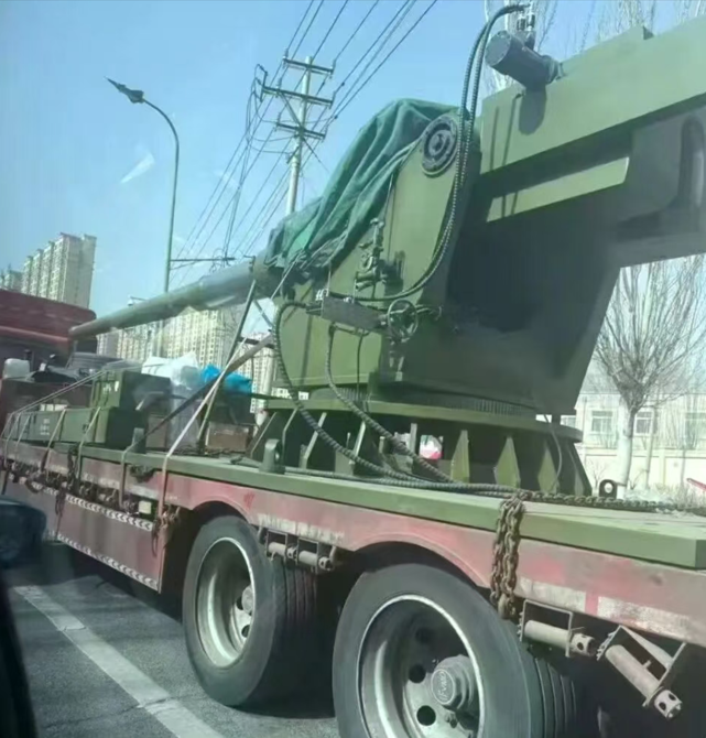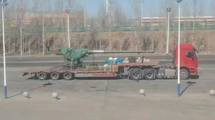 这款国营某厂研制的155毫米单管舰炮,从网络上的铭牌文字来看,属于“155毫米舰炮弹道炮”,这门样炮或许已完成陆上发射测试,有大型运输车拖着它在公路上奔跑的图片为证。